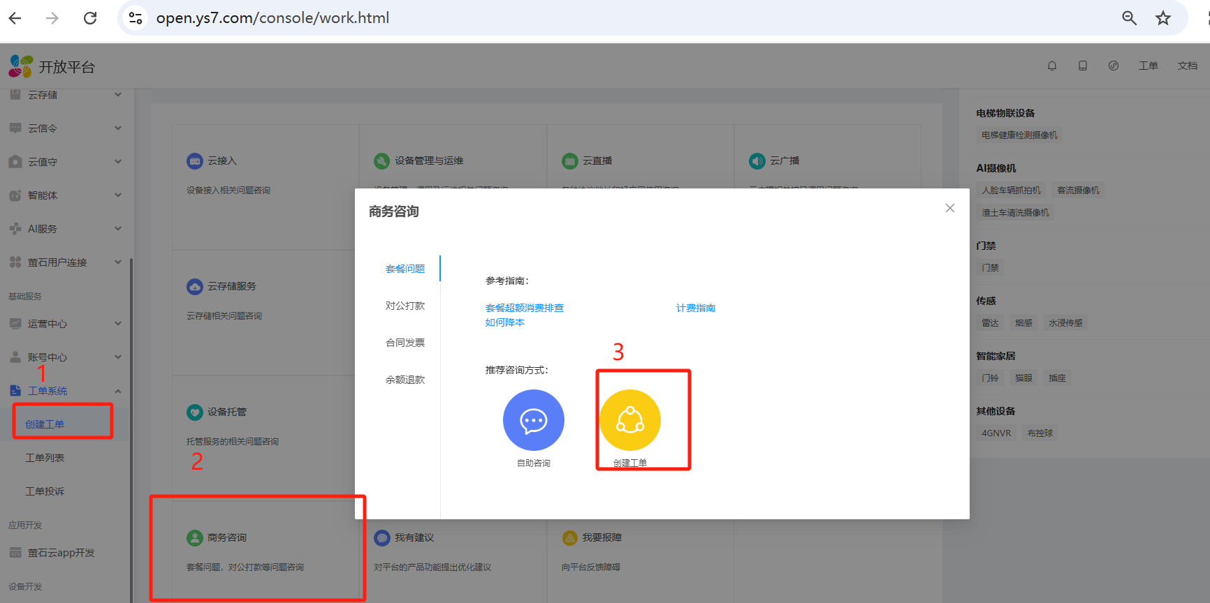 特殊情况: 若在以上页面未取消套餐,也可以通过提交工单的方式联系我们人工取消,工单提交后会在一个工作日取消 1.工单提交入口:https://open.ys7.com/console/work.html 2.点击商务咨询-创建工单 3.工单标题写:取消企业版套餐即可
